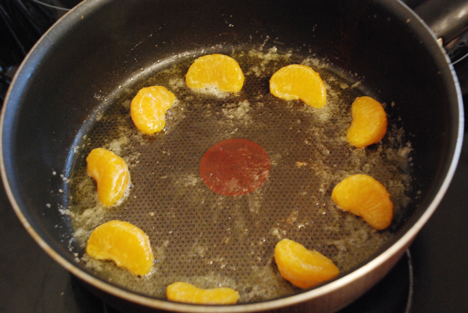 На сковороде растопим масло, всыпем ложку сахара и чуть поджарим мандарин в получившейся недокарамели. Буквально по 2 минуты на среднем огне. Вынем дольки остынуться, а на сковороду отправим изюм. Он уже впитал весь алкоголь, который на сковороде как раз чуть испарится. После 2х минут тоже снимаем и студим.